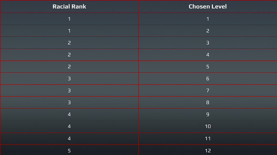 All creatures have a Racial Rank that is determined by their Chosen Level. A Chosen's Racial Rank can only be ranked up through leveling up.